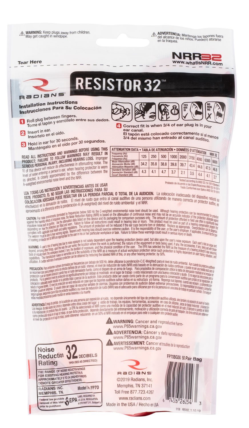 Radians Ear Plugs, Orange, NRR 32, 50 Plugs Per Bag, Resealable Bag FP70BG50
